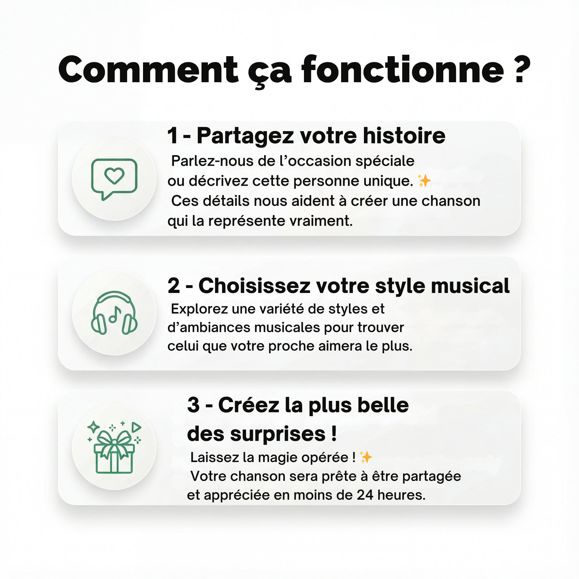 Votre chanson personnalisée vous sera envoyée sous 48 heures par email — au format MP3 (qualité studio).